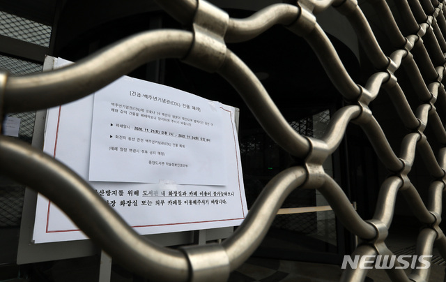 [서울=뉴시스] 이영환 기자 = 22일 오전 서울 성북구 고려대학교 백주년기념삼성관이 폐쇄되어 있다. 21일 백주년기념삼성관 내 학술정보관(CDL)에 코로나19 확진자 방문이 확인돼 24일 오전8시께까지 폐쇄될 예정이다. 2020.11.22.
