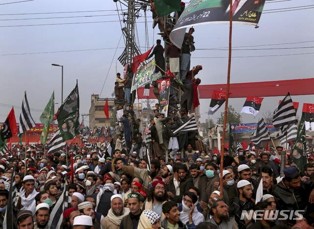 [페샤와르=AP/뉴시스]파키스탄 야당 연합인 파키스탄민주화운동 지지자들이 22일(현지시간) 페샤와르에서 열린 반정부 집회에 참석하고 있다. 이 집회는 임란 칸 총리의 경제 위기 대처 실패에 대해 내각 사퇴 요구의 일환으로 열렸다. 2020.11.23.