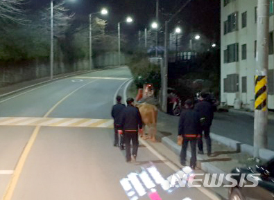 [창원=뉴시스] 강경국 기자 = 경남 창원시 한 골프장 인근 주택가 도로에 소가 활보하자 신고를 받고 촐동한 소방공무원들. (사진=창원소방본부 제공). 2020.11.23. [email protected]