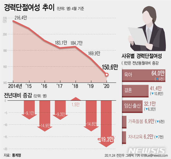 [서울=뉴시스] 24일 통계청에 따르면 올해 4월 기준 경력단절여성는 전년보다 19만3000명 감소한 150만6000명으로 2014년 통계 작성 이래 가장 적었던 것으로 나타났다. 코로나19 확산으로 결혼을 미루는 현상이 두드러지면서 기혼여성이 줄어들고 아이를 낳지 않는 경향이 사회적으로 늘어나고 있기 때문으로 분석된다. (그래픽=전진우 기자)