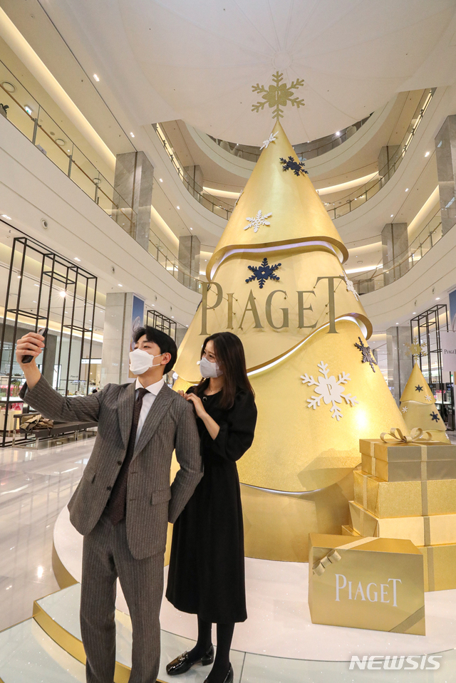 [서울=뉴시스]24일 경기도 성남시 분당구 현대백화점 판교점 1층 중앙광장에 설치된 ‘피아제 크리스마스트리’ 앞에서 고객들이 기념 촬영을 하고 있다. 현대백화점은 오는 12월 21일까지 판교점 1층 중앙광장에서 146년 전통의 스위스 럭셔리 주얼리·시계 브랜드 '피아제(PIAGET)'의 대형 크리스마스 트리를 선보인다. 피아제가 크리스마스트리를 설치한 것은 국내에서 처음이다. 약 10m에 달하는 크리스마스 트리는 금빛 트리에 피아제 로고와 주얼리로 꾸며졌다. (사진=현대백화점 제공) 2020.11.24.