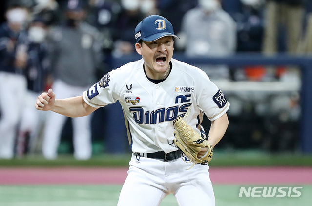 [서울=뉴시스] 이영환 기자 = 24일 오후 서울 구로구 고척스카이돔에서 열린 KBO 한국시리즈 6차전 NC 다이노스와 두산 베어스의 경기, 4대 2로 승리해 한국시리즈 우승을 차지한 NC 마무리 원종현이 기뻐하고 있다. 2020.11.24.