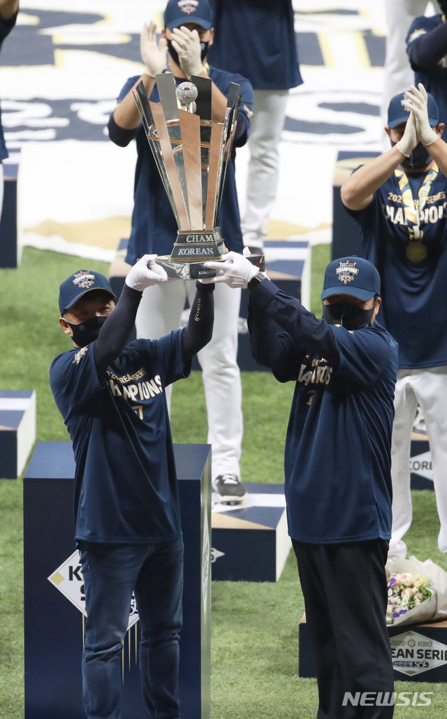 [서울=뉴시스] 고범준 기자 = 24일 오후 서울 구로구 고척스카이돔에서 열린 KBO 한국시리즈 6차전 NC 다이노스와 두산 베어스의 경기, 우승을 차지한 NC 다이노스 김택진(왼쪽) 구단주가 트로피를 들고 기념촬영을 하고 있다. 2020.11.24.