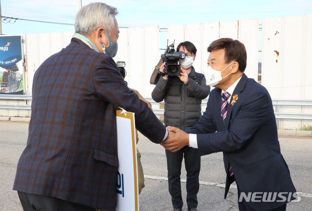 [서울=뉴시스] 박민석 기자 = 김원웅 광복회장이 지난 24일 경기 파주시 통일대교에서 도라산전망대 내 경기도 평화부시장 집무실 설치를 주장하며 유엔사 반대에 맞서 1인 시위를 벌이고 있는 이재강 경기도 평화부지사를 찾아 격려하고 있다. (사진=광복회 제공) 2020.11.25.