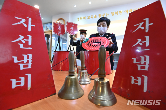 [수원=뉴시스] 김종택기자 = 25일 오후 경기도 수원시 팔달구 인계동 구세군수원교회에서 관계자들이 자선냄비 모금 활동을 앞두고 장비를 정리하고 있다. 수원지역 모금활동은 다음달 7일부터 시작된다. 2020.11.25.