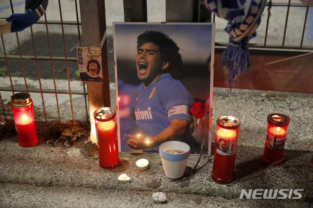 [나폴리=AP/뉴시스]25일(현지시간) 이탈리아 나폴리에 있는 SSC 나폴리의 홈구장인 산 파올로 경기장 밖에 디에고 마라도나의 사진과 그를 추모하는 촛불이 놓여 있다. 1986년 아르헨티나를 월드컵 우승으로 이끈 아르헨티나 축구 영웅 디에고 마라도나가 25일 아르헨티나 부에노스아이레스 자택에서 심장마비로 타계했다. 향년 60세. 2020.11.26.
