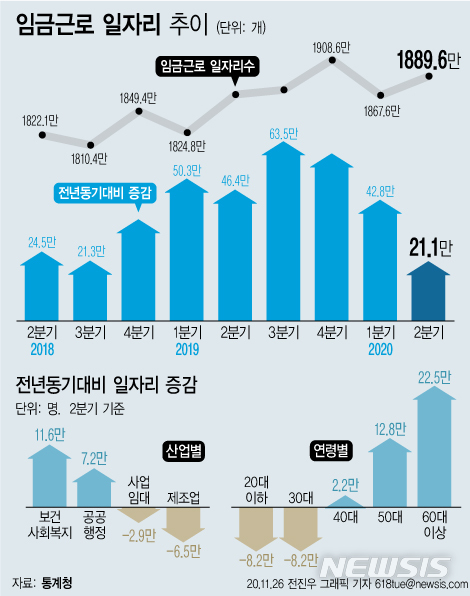 [서울=뉴시스] 26일 통계청에 따르면 올해 2분기 임금근로 일자리가 지난해 보다 21만1000개 증가했다. 대부분은 60대 이상 고령층에 집중되었으며 20대 이하·30대의 임금 근로 일자리가 16만개 이상 사라진 것으로 나타났다. (그래픽=전진우 기자)