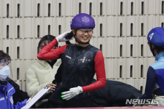 [의정부=뉴시스] 고승민 기자 = 26일 의정부 실내빙상장에서 열린 제37회 전국남녀 쇼트트랙스피드스케이팅 대회 여자 일반부 1500m 준결승 2조 경기, 심석희(보라색 모자, 서울시청)이 경기 전 선수들과 대화하며 웃음짓고 있다. 2020.11.26.