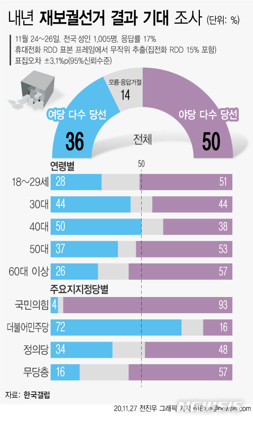 [서울=뉴시스]한국갤럽이 내년 서울시장·부산시장 보궐선거를 비롯한 재보선에 대해 조사한 결과, '현 정부를 견제하기 위해 야당 후보가 많이 당선돼야 한다'는 주장에 동의하는 응답이 50%로 나타났다.