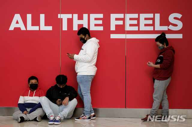[글렌데일=AP/뉴시스]블랙 프라이데이인 27일(현지시간) 미 캘리포니아주 글렌데일의 글렌데일 갤러리아 앞에서 마스크를 쓴 쇼핑객들이 입장 순서를 기다리고 있다. 올해 블랙 프라이데이는 코로나19 여파로 비대면 온라인 주문을 선택하는 사람이 많아 예년보다 쇼핑객 수가 준 것으로 알려졌다. 2020.11.28.