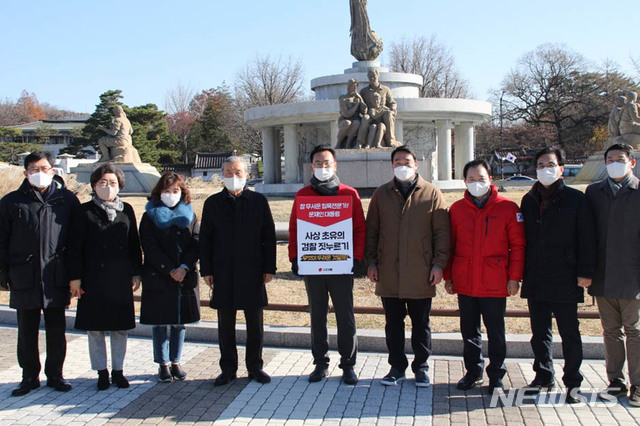 [서울=뉴시스] 최동준 기자 = 김종인 국민의힘 비상대책위원장이 28일 오전 서울 종로구 청와대 앞 분수대에서 1인 시위를 하고 있는 유상범 국민의힘 의원을 찾아 격려하고 있다. (사진=국민의힘 제공) 2020.11.28. [email protected]