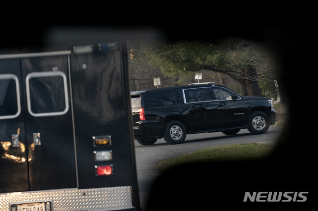 [뉴어크=AP/뉴시스]조 바이든 미국 대통령 당선인이 탑승한 차량 행렬이 29일(현지시간) 델라웨어주 뉴어크에 있는 정형외과에 들어서고 있다. 바이든 당선인은 반려견 메이저와 놀다가 미끄러져 발목을 삔 것으로 전해졌다. 2020.11.30.