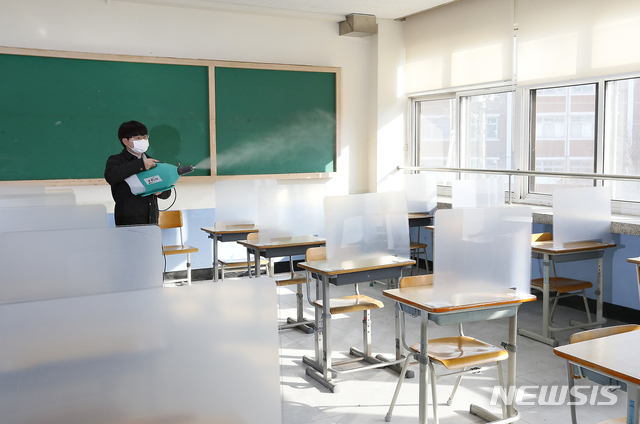[청주=뉴시스] 인진연 기자 = 2021학년도 대학수학능력시험을 사흘 앞둔 30일, 56시험지구 7시험장인 충북 청주 청석고등학교 시험실에서 교직원이 소독을 하고 있다. 2020.11.30