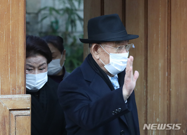 [서울=뉴시스] 조수정 기자 = 회고록을 통해 '5·18 당시 광주 상공에서 헬기 사격을 목격했다'는 고 조비오 신부의 명예를 훼손한 혐의로 기소된 전직 대통령 전두환 씨가 광주지방법원에서 열리는 1심 선고 공판에 출석하기 위해 30일 오전 서울 연희동 자택을 나서며 손을 들어보이고 있다. 2020.11.30.