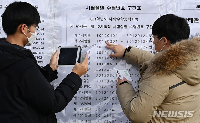 [수원=뉴시스] 김종택기자 = 2021학년도 대학수학능력시험 예비소집일인 2일 오후 경기도 수원시 장안구 조원고등학교에서 수험생들이 시험실을 확인하고 있다. 2020.12.02.