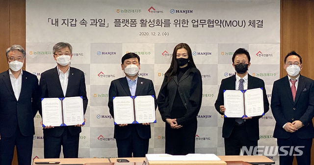 [서울=뉴시스] 조수정 기자 = 농협경제지주가 2일 서울시 중구 한진 본사에서 한진, 한국선불카드와 과일전용 기프트카드인 '내 지갑 속 과일' 플랫폼 구축 및 활성화를 위한 업무협약을 체결했다. 왼쪽 두번째부터 농협경제지주 장철훈 농업경제대표이사, 한진 노삼석 대표이사, 한진 조현민 전무, 한국선불카드 최병호 대표이사. (사진=농협 제공) 2020.12.02.