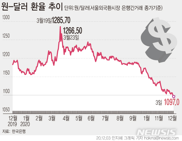 [서울=뉴시스]3일 서울 외환시장에서 원·달러 환율은 전 거래일(1100.8원)보다 3.8원 내린 1097.0원에 장을 마감했다. 원·달러 환율이 1100원대 아래로 내려간 건 지난 2018년 6월15일(1097.7원) 이후 약 2년 6개월 만이다. (그래픽=안지혜 기자)