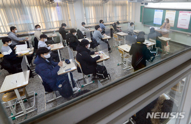 [인천=뉴시스] 이종철 기자 = 신종 코로나바이러스감염증(코로나19) 사태 속에 3일 오전 인천시 부평구 부평고등학교에서 치러지는 2021학년도 대학수학능력시험(수능)에서 수험생들이 시험시작을 기다리고 있다. 2020.12.03. [email protected]