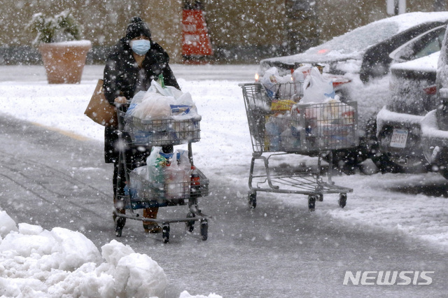 [말버러=AP/뉴시스]5일(현지시간) 미 북동부 지역에 올 시즌 첫 눈보라가 몰아치는 가운데 매사추세츠주 말버러 시내의 한 식료품점 주차장에서 쇼핑을 마친 여성이 폭설 속 카트를 끌고 있다. 2020.12.06.