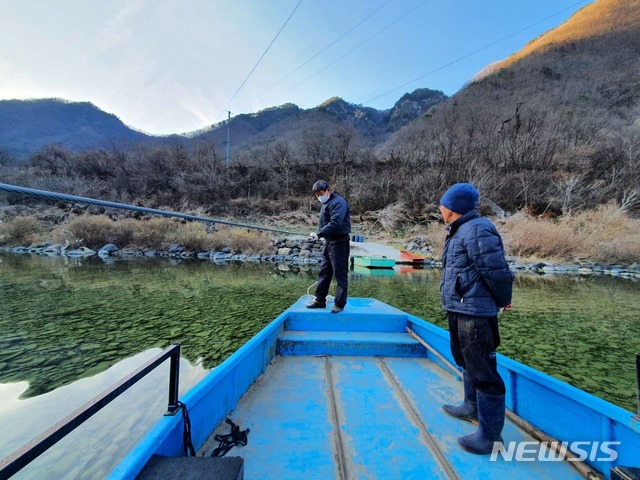 [영월=뉴시스]김유나 기자 = 9일 오전 강원 영월군 영월읍 문산리 가정마을 주민들이 마을 외부로 향하는 유일한 교통수단인 줄배를 타고 강을 건너고 있다. 2020.12.09. [email protected]