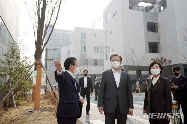 [화성=뉴시스]추상철 기자 =문재인 대통령이 11일 오전 경기 화성시 LH 임대주택 100만호 기념단지인 동탄 공공임대주택에서 '살고 싶은 임대주택 현장점검' 위해 김현미 국토교통부 장관과 국토교통부 장관 후보자인 변창흠 LH사장과 함께 이동하고 있다. 2020.12.11. [email protected]