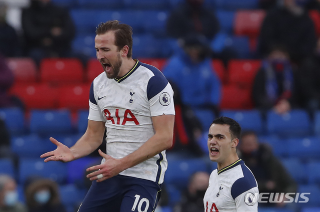 [런던=AP/뉴시스]토트넘 홋스퍼 해리 케인이 13일(현지시간) 영국 런던의 셀허스트 파크에서 열린 2020-21 잉글리시 프리미어리그(EPL) 12라운드 크리스털 팰리스와의 경기 전반 손흥민의 도움으로 선제골을 넣고 환호하고 있다. 손흥민은 전반 23분 해리 케인의 선제골에 리그 4호 도움을 기록했으며 토트넘은 후반 실점해 1-1 무승부를 기록했다. 2020.12.14.