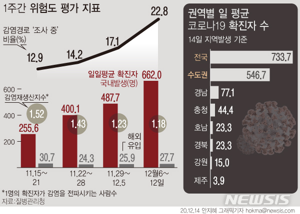 [그래픽]최근 1주 일평균 국내 확진 733.7명…수도권 546.7명