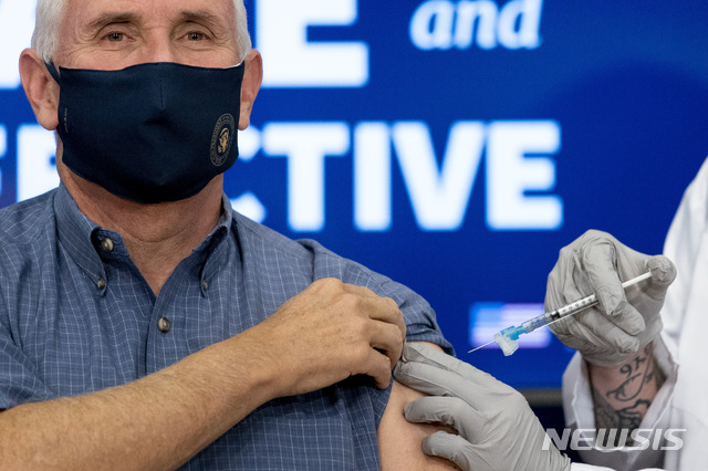 [워싱턴=AP/뉴시스]마이크 펜스(61) 미국 부통령이 18일(현지시간) 백악관에서 화이자 백신을 접종하고 있다. 펜스 부통령은 접종 뒤 "아무것도 느끼지 못하고 잘 끝냈다"라며 "이번 주가 코로나19 대유행 끝의 시작으로 기록될 것"이라고 말했다. 2020.12.19.