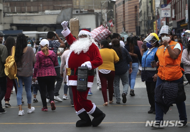 [리마=AP/뉴시스]18일(현지시간) 페루 수도 리마의 인기 크리스마스 쇼핑 장소인 메사 레돈다 시장에서 산타클로스 복장을 한 한 남성이 행인들에게 인사하고 있다. 페루의 코로나19 누적 확진자 수는 전날보다 3327명늘어난 99만1518명, 사망자는 104명 늘어난 3만6858명으로 집계됐다. 2020.12.19.