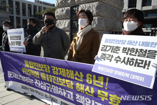 [서울=뉴시스]김명원 기자 = 오병윤 전 통합진보당 원내대표가 19일 오전 서울 종로구 헌법재판소 앞에서 통합진보당 해산 6년, 문재인 정부의 통합진보당 해산 진상규명과 책임자 처벌 촉구 기자회견을 하고 있다. 2020.12.1.9 [email protected]