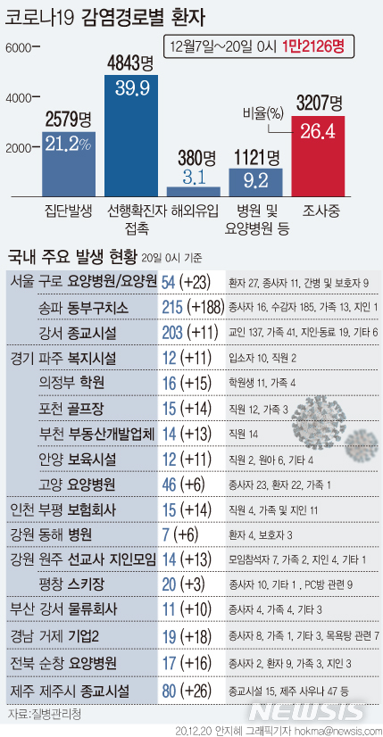 [그래픽]동부구치소 관련 누적 215명…요양병원·골프장·학원 등 일상 곳곳 감염
