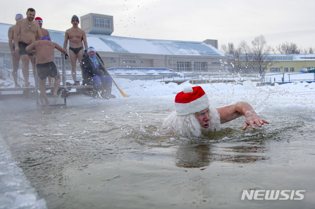 [옴스크=AP/뉴시스]26일(현지시간) 러시아 옴스크에서 산타 모자를 쓴 한 남성이 얼음물 속에서 수영하고 있다. 옴스크의 이날 온도는 영하 32도까지 떨어졌다. 2020.12.27.