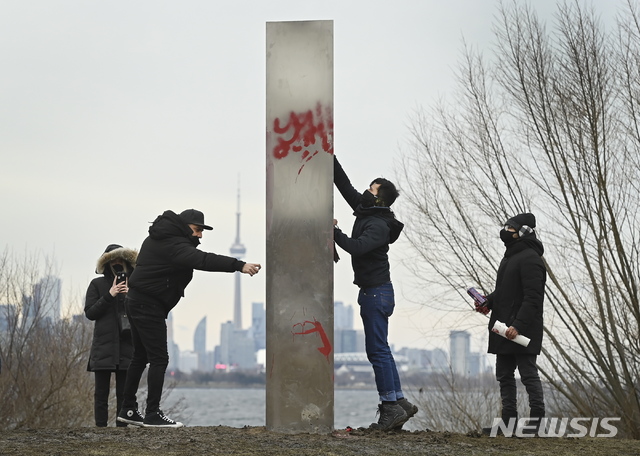 [토론토=AP/뉴시스]1일(현지시간) 캐나다 토론토의 험버베이 공원에서 한 남성이 금속 모노리스의 낙서를 청소하고 있다. 모노리스는 지난해 12월 31일 오전 이 공원에 나타났으며 최근 미국 유타 사막과 루마니아 등지에서 발견된 모노리스와 비슷하게 생긴 것으로 알려졌다. 모노리스 출현에 많은 사람이 소셜 미디어에 사진을 올리기 위해 모여드는 것으로 나타났다. 2021.01.02.