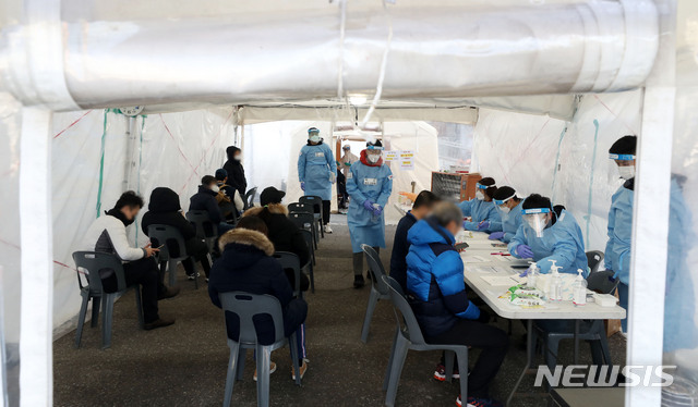 [서울=뉴시스]홍효식 기자 = 신종 코로나바이러스 감염증(코로나19) 신규 확진자가 715명으로 집계된 5일 서울 서대문구 신촌기차역 공영주차장에 마련된 임시선별진료소에서 시민들이 검사를 받기 위해 대기하고 있다. 2021.01.05. [email protected]