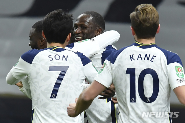 [런던=AP/뉴시스]손흥민(왼쪽)이 5일(현지시간) 영국 런던의 토트넘 홋스퍼 스타디움에서 열린 2020-21시즌 카라바오컵(리그컵) 브렌트포드와의 준결승전에 선발 출전해 전반 12분 선제골을 넣은 무사 시소코를 축하하고 있다. 손흥민은 후반 25분 팀의 두 번째 골을 넣어 유럽 무대 개인 통산 150호골을 기록하며 토트넘의 2-0 승리에 이바지했다. 2021.01.06.