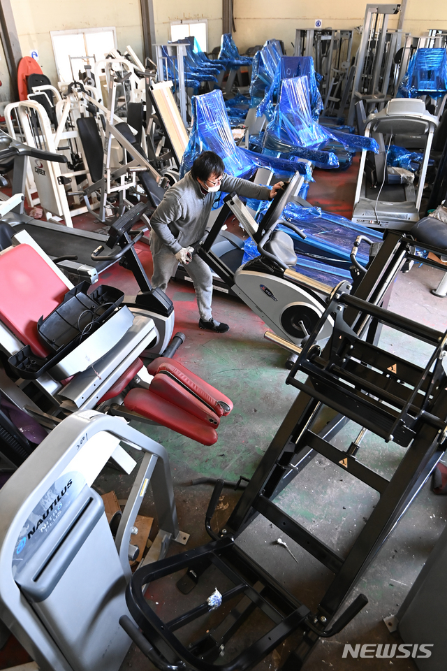 [용인=뉴시스] 김종택기자 = 신종 코로나바이러스 감염증(코로나19) 장기화로 폐업을 하는 헬스장 등 실내체육시설이 늘어나면서 중고 헬스기구 매물이 증가하고 있는 가운데 6일 오후 경기도 용인시의 한 중고 헬스기구 매입 및 판매업체 창고에 헬스기구가 가득 쌓여있다. 2021.01.06.
