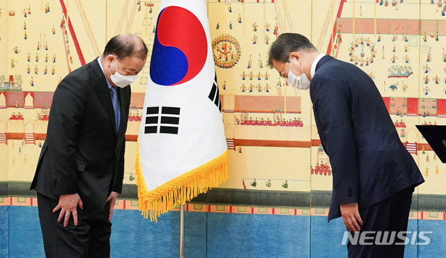 [서울=뉴시스]박영태 기자 = 문재인 대통령이 14일 오전 청와대 본관에서 강창일 주일대사에게 신임장을 수여하기 전 인사하고 있다. 2021.01.14. [email protected]