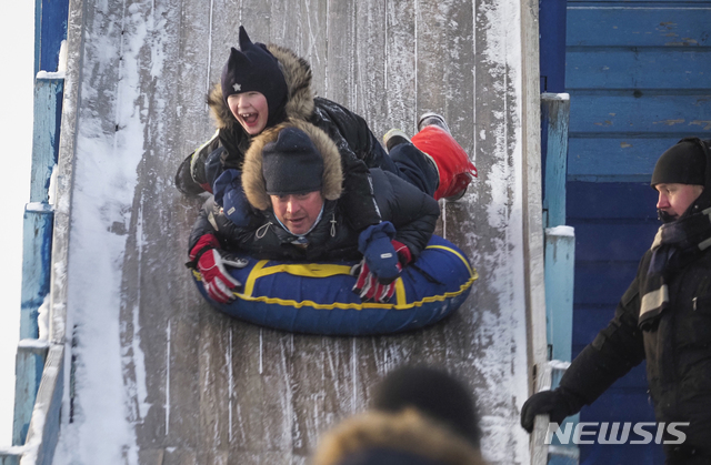 [상트페테르부르크=AP/뉴시스]16일(현지시간) 러시아 상트페테르부르크의 기온이 영하 15도를 기록한 가운데 한 남성이 아들과 함께 공원에서 썰매를 타고 있다. 2021.01.17.