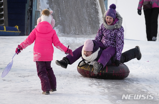[상트페테르부르크=AP/뉴시스]16일(현지시간) 러시아 상트페테르부르크의 기온이 영하 15도를 기록한 가운데 공원에서 아이들이 썰매를 즐기고 있다. 2021.01.17.
