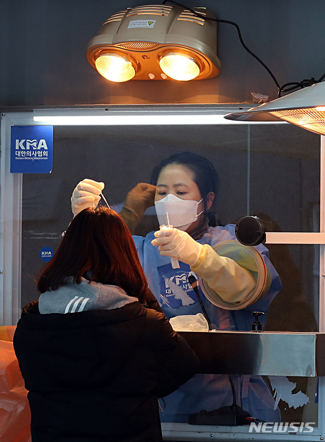 [서울=뉴시스]이영환 기자 = 17일 오전 서울 중구 서울광장에 마련된 신종 코로나바이러스 감염증(코로나19) 임시 선별 검사소에서 한 의료진이 검체 채취를 하고 있다. 방역당국은 '설 연휴 특별방역기간'인 다음달 14일까지 수도권 130개 검사소를 연장운영 한다고 밝혔다. 2020.01.17. [email protected]