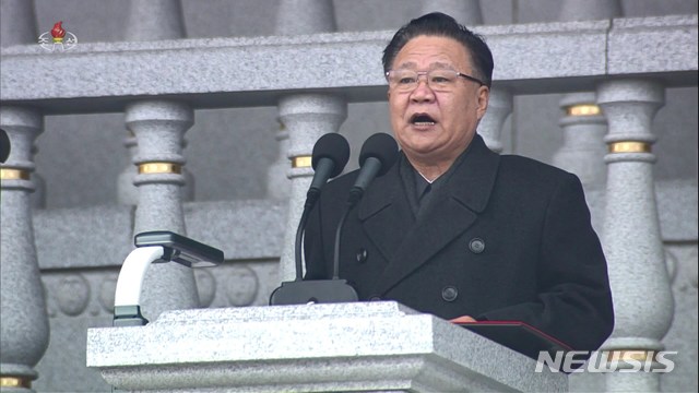 [서울=뉴시스]조선중앙TV가 17일 북한 평양 김일성광장에서 노동당 제8차대회 결정을 철저히 관철하기 위한 평양시군민연합대회를 개최했다고 보도했다. 사진은 최룡해 최고인민회의 상임위원회 위원장이 연설하는 모습. (사진=조선중앙TV 캡쳐) 2020.11.17. [email protected]