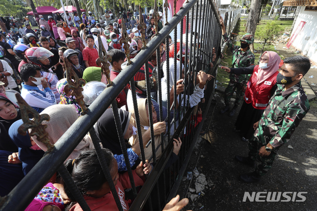 [마무주=AP/뉴시스]18일 인도네시아 웨스트 술라웨시주 마무주에서 지진 피해 주민들이 구호품을 받기 위해 몰려들고 있다. 지난 15일 발생한 지진으로 80여 명이 숨지고 600여 명이 다친 가운데 구조대는 수색 작업을 이어가고 있으며 피해 주민들에게 구호품이 도착하고 있다. 2021.01.18.