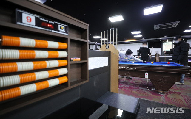 [서울=뉴시스]고범준 기자 = 헬스장, 당구장 등 실내체육시설이 영업을 재개한 18일 오후 서울 서대문구의 한 당구장에서 고객들이 당구를 치고 있다. 수도권 실내체육시설과 노래연습장 등 대부분의 다중이용시설은 이용 인원을 시설 면적 8㎡(약 2.4평)당 1명으로 제한해 운영이 재개된다. 2021.01.18. [email protected]