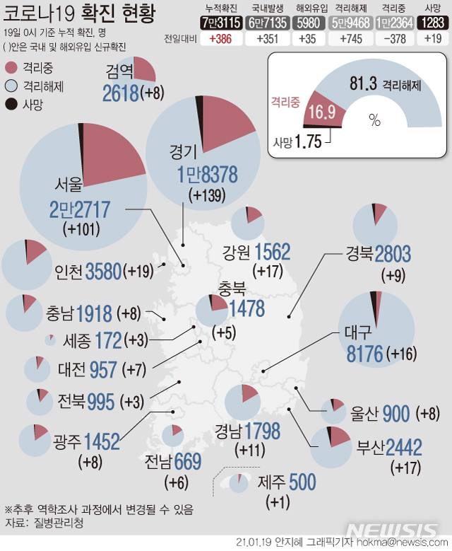 [서울=뉴시스] 19일 질병관리청에 따르면 이날 0시 기준 누적 확진자는 전날 0시 이후 386명 증가한 7만3115명이다. 확진자 중 사망자 비율인 치명률은 약 1.75%다. (그래픽=안지혜 기자)