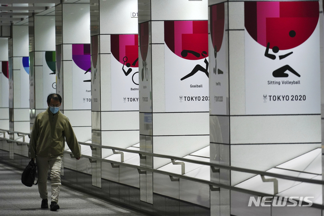 [도쿄=AP/뉴시스]19일 코로나19 예방을 위해 마스크를 쓴 한 남성이 일본 도쿄에서 2020 도쿄 올림픽 현수막 근처를 걷고 있다. 도쿄에서는 이날 1240명의 코로나19 신규 확진자가 보고됐다. 2021.01.19.