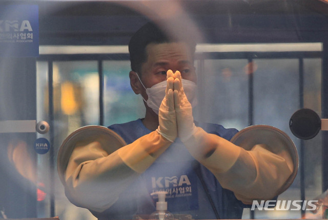 [서울=뉴시스]박민석 기자 = 국내 신종 코로나바이러스 감염증(코로나19) 확진자 발생 1년을 하루 앞둔 19일 오후 서울 중구 서울특별시청 앞에 마련된 코로나19 임시선별검사소에서 의료진이 두 손을 모으고 있다. 2021.01.19. [email protected]