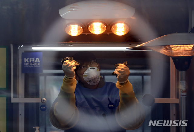 [서울=뉴시스]최진석 기자 = 국내 첫 신종 코로나바이러스 감염증(코로나19) 확진자 발생 1년이된 20일 중구 서울광장 임시선별검사소에서 의료진이 언 손을 온열기구에 녹이고 있다. 2021.01.20. [email protected]