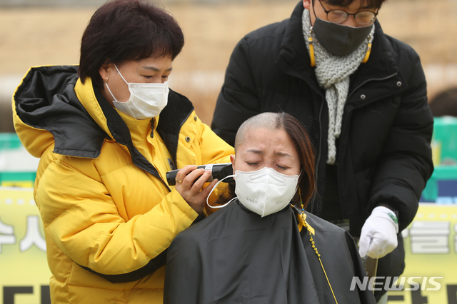 [서울=뉴시스]이윤청 기자 = 4.16세월호참사가족협의회, 4월16일의약속국민연대 등 시민사회단체 관계자들이 22일 서울 종로구 청와대 사랑채 앞에서 진상 규명 약속 이행을 위한 대통령의 답변을 요구하며 삭발을 하고 있다. 2021.01.22. [email protected]