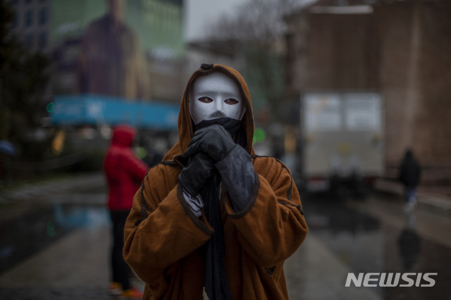 [마드리드(스페인)=AP/뉴시스]스페인 수도 마드리드에서 23일(현지시간) 가면을 쓴 한 남성이 신종 코로나바이러스 감염증(코로나19)에 따른 규제에 반대하는 시위에 참가하고 있다. 신종 코로나바이러스 감염증(코로나19) 백신 접종과 관련한 국가 규정을 어기고 백신을 새치기 접종한 스페인군 참모총장과 고위 장성들이 강제 전역당했다. 2021.1.24