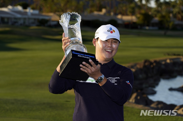 [라킨타=AP/뉴시스]김시우가 24일(현지시간) 미 캘리포니아주 라 킨타의 PGA웨스트 피트 다이 스타디움 코스에서 열린 미프로골프(PGA) 투어 아메리칸 익스프레스에서 우승, 트로피를 들고 포즈를 취하고 있다. 김시우는 최종합계 23언더파 265타로 패트릭 캔틀레이(미국)를 1타 차로 따돌리고 우승했다. 2021.01.25.